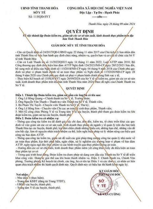 Cục An toàn thực phẩm, Bộ Y tế cho biết, hiện nay, có tình trạng giả mạo văn bản của Sở Y tế (như Thông báo, Quyết định về việc thành lập Đoàn thanh tra, kiểm tra, giám sát) với nội dung sẽ tiến hành kiểm tra tại các cơ sở sản xuất, kinh doanh thực phẩm trên địa bàn nhằm gây tâm lý hoang mang, lo sợ để từ đó yêu cầu các chủ cơ sở nếu muốn không bị kiểm tra thì chuyển tiền để không bị kiểm tra với mục đích lừa đảo chiếm đoạt tài sản.