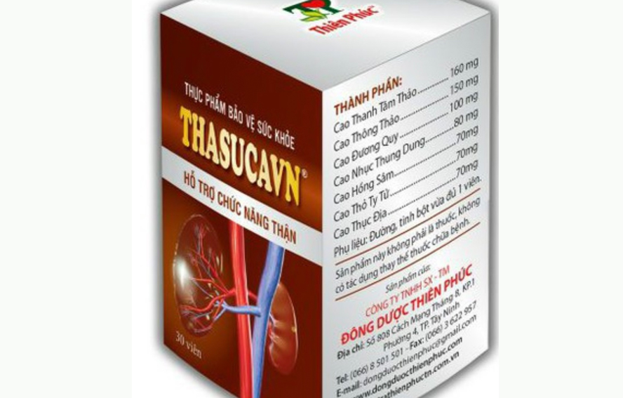 Thực phẩm bảo vệ sức khỏe Thasucavn®plus được quảng cáo có công dụng hỗ trợ thận, bổ máu, bù lượng máu do suy thận mất máu, thiếu hụt máu; bồi bổ tái tạo thận, nuôi dưỡng thận, chức năng thận có cơ hội phục hồi; đào thải nước tiểu, độc tố qua đường đại tiện, tiểu tiện, tránh tràn dịch giúp cơ thể giảm phù…